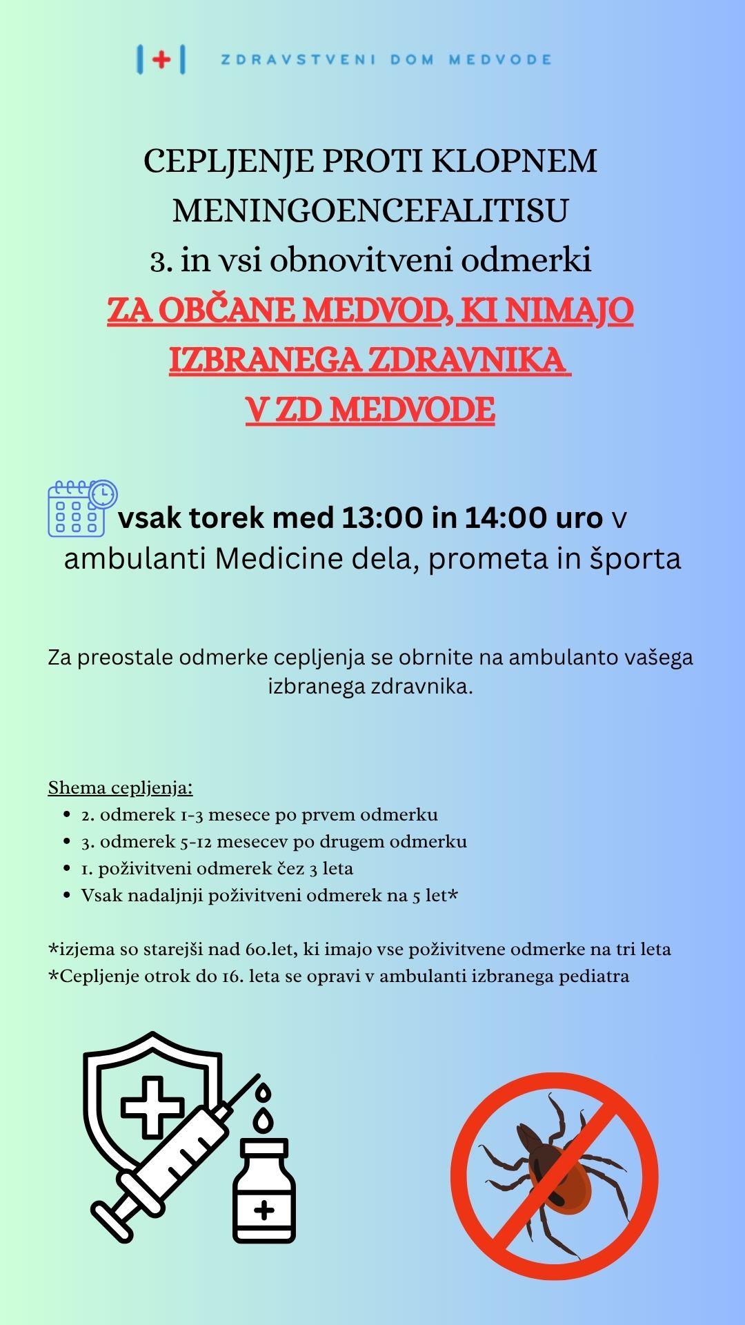 CEPLJENJE PROTI KLOPNEM MENINGOENCEFALITISU ZA OBČANE MEDVOD - 3. IN VSI OBNOVITVENI ODMERKI